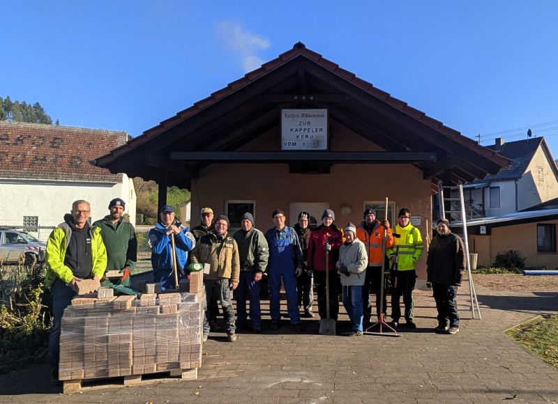 Gemeindearbeitstag: OIE AG unterstützt den Bau einer GrillholzlagerstätteAuch Dank der Hilfe der OIE AG in Idar-Oberstein konnte am Gemeindearbeitstag mit dem Bau der Holzlagerstätte neben dem Häuschen am Perlbachplatz begonnen werden. Drei Paletten Pflastersteine wurden als Unterboden verlegt.