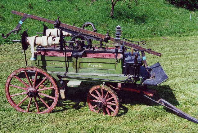 Aus Großvaters Zeiten ist ein alter Spritzenwagen im Besitz der Feuerwehr, der noch mit Pferden gezogen wurde und bei dem von Hand gepumpt worden ist.